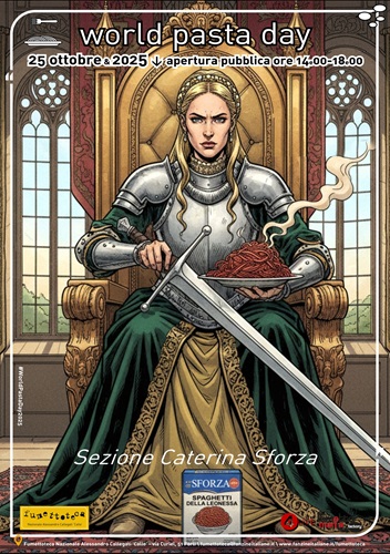 “Con questa iniziativa vogliamo dimostrare come il fumetto possa essere uno straordinario veicolo per esplorare la storia e la cultura in modo innovativo e divertente – dichiara GianLuca Umiliacchi Direttore fumettotecario – l’iniziativa della ‘Sezione Caterina Sforza’ è focalizzata sul tema della pasta e della gastronomia, utilizzando l’immagine della ‘Tigre di Forlì’, offrendo un eccezionale mix di storia, arte e tradizione locale. Caterina con la sua inesauribile curiosità, diventa la musa perfetta per unire la tradizione culinaria della pasta con un tocco di ‘scienza’ e umorismo, rendendo omaggio alla sua intelligenza e al patrimonio gastronomico italiano. La nostra proposta creativa, che unisce storia, cultura e gastronomia, vede come Fil Rouge Storico la Cucina Rinascimentale (XV-XVI secolo), della nobildonna esperta di chimica, alchimia e cosmesi, come documentato dal suo famoso Ricettario. Con il World Pasta Day celebriamo la pasta come elemento centrale della dieta mediterranea, della convivialità e della cultura italiana e, per l’occasione, focalizziamo l’immagine sugli speghetti.” Il ‘World Pasta Day’ è la ‘Giornata Mondiale della Pasta‘, un evento che si celebra internazionalmente ogni anno il 25 ottobre per onorare e promuovere uno degli alimenti più amati e versatili al mondo, pilastro della Dieta Mediterranea. Istituito nel 1995 a Roma, durante il primo Congresso Mondiale della Pasta (World Pasta Congress), da 40 produttori di pasta internazionali, con l’obiettivo principale di valorizzare la pasta, evidenziandone gli aspetti culturali, economici, scientifici e gastronomici, e promuoverla come cibo sano, nutriente, accessibile e sostenibile. L’evento è organizzato dall’International Pasta Organization (IPO), spesso in collaborazione con l’Unione Italiana Food. Durante questa giornata, in diverse città del mondo si tengono eventi, conferenze, degustazioni e iniziative per celebrare la pasta. In Italia, è un’occasione speciale per ribadire il ruolo del Paese come leader mondiale nella produzione e nel consumo di questo alimento.