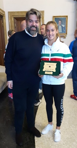 FERRARA – Ieri (lunedì 5 novembre) nel Municipio di Ferrara, l’assessore allo Sport Simone Merli ha consegnato alla giovane tennista ferrarese Giulia Martinelli una targa di riconoscimento, a nome dell’Amministrazione comunale, per gli importanti risultati conseguiti nella recente stagione agonistica. Attuale campionessa italiana individuale di tennis Under 14 e a squadre Under 16, l’atleta ferrarese (ma affiliata al circolo Tennis Bologna) da ottobre si è trasferita al Centro Tecnico di Formia. Nel vivaio federale potrà studiare e allenarsi a tempo pieno nell’ambito di un progetto di crescita sportiva di primissimo livello, allenata da Tatiana Garbin affiancata dai tecnici Antonio Canavacciulo e Vittorio Magnelli.