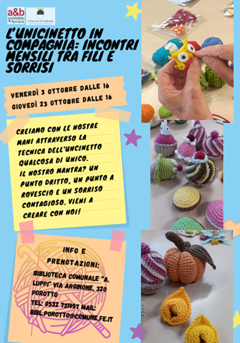 FERRARA – Ripartono gli appuntamenti per adulti dedicati all’arte dell’uncinetto, alla biblioteca comunale Aldo Luppi (via Arginone 320, Porotto). Due gli incontri in programma nel mese di ottobre 2025: venerdì 3 e giovedì 23 alle 16:00.