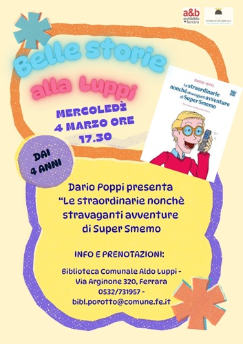 FERRARA – Sarà “Super Smemo” con le sue “straordinarie nonché stravaganti avventure” il protagonista dell’appuntamento di mercoledì 4 marzo 2026, alle 17:30 con le “Belle storie” per i più piccoli, alla biblioteca comunale Luppi, di via Arginone 320 (Porotto – Ferrara). L’autore Dario Poppi, con la collaborazione di Maria Grazia Giovannini e Pasquale Ritucci, condurrà il pubblico di adulti e bambini a immergersi nel mondo divertente e sorprendente di Super Smemo.