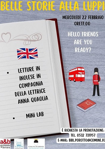 FERRARA – “Hello friends are you ready?”: mercoledì 22 febbraio 2023 alle 17 pomeriggio tutto dedicato alle ‘Belle storie’ in inglese per i più piccoli, alla biblioteca comunale Aldo Luppi di Porotto (via Arginone 320, Ferrara). La lettrice volontaria Anna Quaglia proporrà letture tratte da “La fabbrica di cioccolato” di Roald Dahl e, a seguire, i bambini saranno coinvolti in un mini-lab.