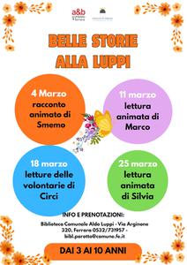 FERRARA – Proseguono i mercoledì in compagnia delle “Belle storie” per i più piccoli alla biblioteca comunale Aldo Luppi (via Arginone 320, Porotto). Il nuovo appuntamento, per bambine e bambini dai 3 ai 10 anni, è previsto per mercoledì 25 marzo 2026 alle 17:00, con le letture animate a cura Silvia Cariani alla scoperta di tante nuove avventure divertenti e coinvolgenti. E per concludere, spazio alla fantasia con un laboratorio creativo per tutti i piccoli partecipanti.
