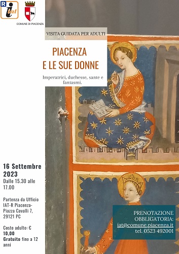Sabato 16 settembre, dalle 15.30 alle 17, camminata alla scoperta di “Piacenza e le sue donne”, sulle orme delle grandi figure femminili che hanno caratterizzato la storia del territorio: imperatrici, duchesse, sante e fantasmi, le cui storie sono custodite tra le vie del centro, gli antichi palazzi e le chiese. Anche in questo caso, partecipazione gratuita per i bambini e ragazzi sino ai 12 anni, 10 euro per tutti gli altri.