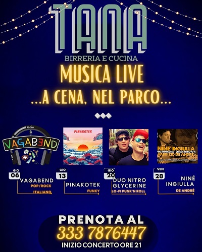 CATTOLICA (RN) – Dopo il successo ottenuto con gli “Aperitivi In musica” nel mese di maggio, alla Tana di Cattolica (Parco della Pace), si replica a luglio con i “Giovedì in musica live… A cena nel parco…”. Quattro serate accompagnate dalla musica di band della zona, a cominciare da giovedì 6 luglio con “Vagabend”, invece il 13 luglio sarà la volta dei “Pinakotek”. Si proseguirà il 20 luglio con i “Nitroglycerine Duo”, per finire in bellezza, il 28 luglio, con Ninè Ingiulla – Omaggio a Faber, con una cena “Pro Romagna”, per sostenere le popolazioni colpite dall’alluvione.