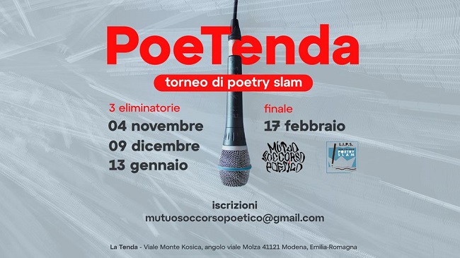 MODENA – È dedicato al poetry slam, una sfida di poesia a “colpi” di versi, l’appuntamento del week end alla Tenda, dove prosegue la rassegna culturale inserita nell’ambito delle attività proposte dall’assessorato alle Politiche giovanili del Comune di Modena. Nella serata di venerdì 13 gennaio, infatti, è in programma la terza e ultima tappa della fase eliminatoria di “PoeTenda”, il torneo curato da Mutuo soccorso poetico di cui il 17 febbraio è in calendario la finale che sarà ospitata sempre dalla struttura di viale Monte Kosica. L’iniziativa, alle ore 21, è a ingresso gratuito.