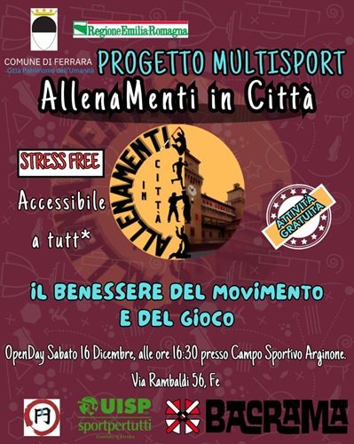 FERRARA – “AllenaMenti in città” è il titolo di un nuovo progetto basato sull’offerta di pacchetti gratuiti di attività sportive, finalizzate a coniugare movimento e benessere fisico con elementi di relazione ed educazione per i giovani. Un percorso sperimentale volto a rispondere ai bisogni delle nuove generazioni, a contrastarne il disagio e l’esclusione sociale attraverso la diffusione e la promozione della cultura e dei valori educativi e formativi dello sport. Il progetto si rivolge ai giovani dai 14 ai 30 anni e alle loro famiglie e sarà presentato a tutti i cittadini interessati sabato 16 dicembre 2023 alle 16.30 al Campo sportivo Arginone (via Rambaldi 56, Ferrara).