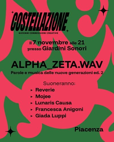 PIACENZA – Dopo i diversi incontri con grandi professionisti della musica italiana, il 7 novembre alle 21, all’interno dei Giardini Sonori di Piacenza, arriva il momento conclusivo della seconda edizione del percorso per giovani artisti ALPHA_ZETA.WAV, parte del più ampio programma “Costellazione – Giovani Connessioni Creative” promosso dall’Associazione GA/ER – Giovani Artisti dell’Emilia-Romagna.