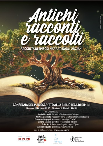 E affinché la condivisione sia più estesa possibile e duratura nel tempo, l’antologia di racconti nata da questa esperienza verrà affidata alla custodia della Biblioteca civica che riceverà la prima copia del testo in occasione della restituzione pubblica dell’intero progetto prevista per giovedì 28 marzo alle ore 16 nella sala della Cineteca comunale di via Gambalunga 27. Saranno presenti alla cerimonia di consegna Nadia Bizzocchi direttrice della Biblioteca Gambalunga, Kristian Gianfreda Assessore per la Salute e la Protezione Sociale, Francesco Bragagni Assessore con delega Ci.VI.VO, Simone Scranni direttore tecnico Coop. Il Cigno, Erika Suzzi referente Progetto coop. Il Cigno, Claudio Cerquetti della Biblioteca dei semi di Gaia. Con loro le coordinatrici del gruppo di lettura Escoaleggere e, come ispiratori dei testi, gli ospiti della residenza per anziani Le Grazie.