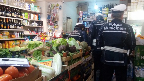 Alimenti a terra privi di indicazioni su provenienza e capi d’abbigliamento senza etichetta. Controlli della Municipale in zona Tempio e stazione Autocorriere