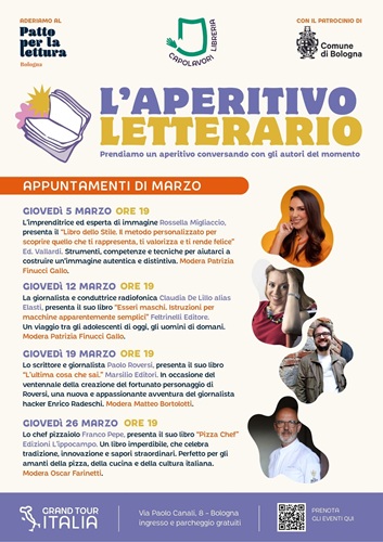BOLOGNA – Di seguito il calendario degli Aperitivi Letterari del giovedì del mese di marzo a Grand Tour Italia: