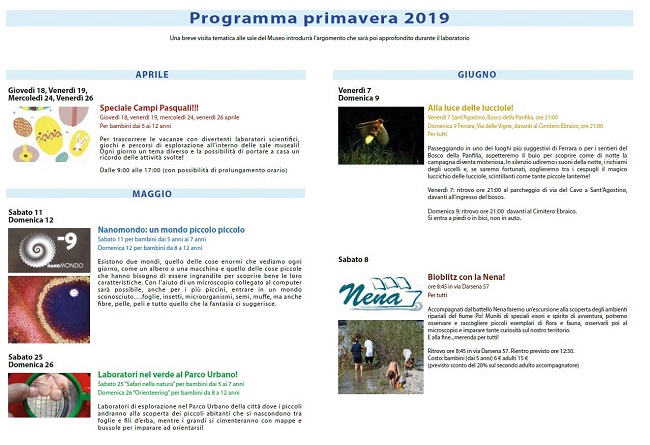 I laboratori, inseriti nel programma di attività didattiche ‘Apprendisti scienziati primavera 2019’, sono organizzati dal Museo di Storia Naturale in collaborazione con l’Associazione Didò, che conduce le attività. Per partecipare è necessaria la prenotazione, da effettuare contattando la sezione didattica del Museo al numero 0532 203381 (lunedì, mercoledì, venerdì – dalle 9 alle 12,30) o all’indirizzo dido.storianaturale@gmail.com. Il costo è di 6 euro per bambino e 2 euro per l’adulto accompagnatore.