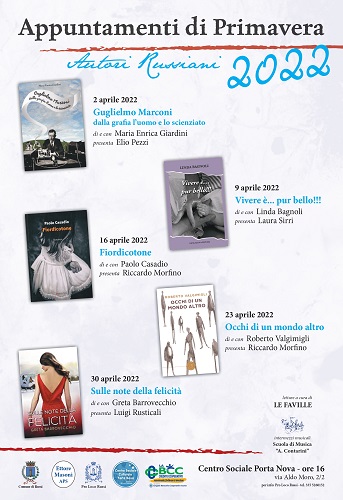 Questo è l’intento delle associazioni di Russi che, con il patrocinio del Comune, hanno promosso gli Appuntamenti di Primavera 2022: Ettore Masoni APS e Pro Loco Russi APS, ospiti per i cinque sabati di aprile del Centro Sociale Porta Nova. Gli autori sono nostri concittadini ed ognuno affronta temi e generi diversi.
