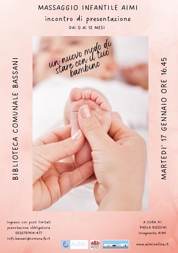 FERRARA – È dedicato ai genitori di bambini da 0 a 12 mesi l’incontro conoscitivo sul massaggio infantile Aimi, in programma martedì 17 gennaio 2023 alle 16,45 alla biblioteca comunale Bassani (via G. Grosoli 42, Barco – Ferrara).