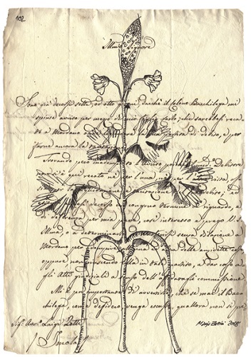Spiega Marisa Zattini: «I recenti erbari realizzati per la mostra nella Moschea Yeni Camii di Salonicco, presentati oggi a Cesena, possono essere intesi come dilatazioni di isole percettive che da tempo vado indagando. Una sorta di “contrappunti” iconici, di sigilli ideali posti ai sogni di antiche identità storico-scientifico mutanti. Identità semantiche che non hanno ancora esaurito le latenze multiple di un’ars reminiscendi. Persistenza di un desiderio, forse, di ri-composizione delle cose. Per ri-conoscere e riaffermare, entrando idealmente nelle loro forme, ciò che il tempo ha disperso e reso superfluo, finanche inutile. Così una missiva d’epoca – circa di due secoli fa – ad un primo sguardo trasmuta le parole calligrafiche in senso lato, emotivamente. Descrittivamente, le possiamo infatti immaginare legate alla narrazione visuale del disegno, tracciato con china e pennino. Appunti e testimonianze d’altri tempi, per mondi immaginari coinvolgenti. Testimonianza di piante metamorfiche mai esistite ma solo sognate e vagheggiate. Il dominio della parola ha ceduto il suo senso ad una realtà più composita e organica. Anche la nozione stessa di “erbario” ha perduto la sua identità per acquisirne un’altra, succedanea, che si sovrappone e giustappone quale immagine iconica rinnovata. Soprattutto nella trasmutazione in negredo che realizzo grazie alle tecnologie del nostro tempo. Il messaggio linguistico descrittivo viene sostituito da emblemi differenti che inglobano i vecchi segni ai nuovi, ridefinendo inediti percorsi fantastici. Il nodo figurale che ne emerge intreccia la mia ricerca inconscia negli smottamenti della memoria, nelle subsidenze di un tempo senza più tempo, che mescola e rimescola scrittura a segno, per coglierne nuove velate essenze, per estrarne succhi rigeneranti e alchemici. Dall’iniziale Erbario manoscritto riminese, terra germinante, opera di anonimo del 1440-1450 ca. – «composto da 92 pagine figurate che contengono 101 immagini di piante oltre alla denominazione della specie e alle informazioni sulle “virtù”, cioè sulle proprietà curative così dell’intera pianta come delle sue singole parti, sui suoi poteri come talismano, nonché sul cosiddetto “tempo balsamico”, vale a dire la stagione e l’ora in cui la pianta è più attiva ed efficace» – ne è emersa una summa trasmutata di “fogli sparsi” e dissimili a ricomporre un prontuario fantastico, artificioso e metamorfico, dove il messaggio linguistico recuperato si discioglie e si integra sui livelli multipli dell’arte»
