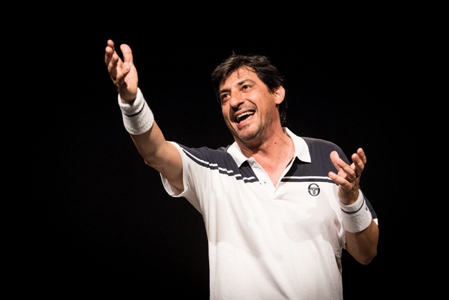 Man mano che insieme a Emilio Solfrizzi mettevamo in scena il testo ci siamo resi conto che potevamo elevare la posta della nostra scommessa puntando a una rappresentazione completamente affidata alla centralità della parola e dell’attore. Mi sono ricordato del “cuntastorie”, una arcaica forma di attore totale siciliano di cui racconta Pitré, un attore di strada provvisto di tre panche per il pubblico e di due spade, unici supporti per raccontare e rappresentare al suo pubblico l’intero ciclo della tavola rotonda. Così, forte dell’interprete che avevo, ho cominciato a togliere e a semplificare, fino a che in scena sono rimaste solo le poche righe bianche che disegnano un campo da tennis e due sedie, quelle sulle quali, nei cambi campo, i tennisti si riposano.