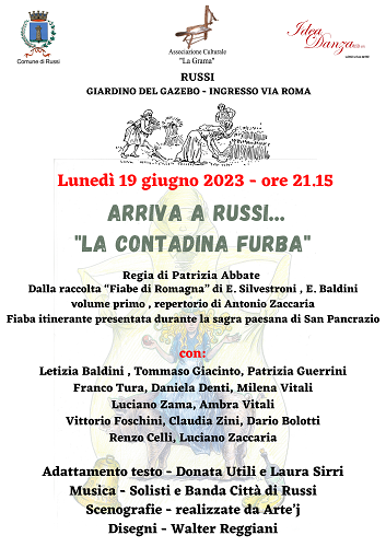 RUSSI (RA) – Lunedì 19 giugno 2023, alle ore 21.15, presso il giardino del gazebo di Russi (ingresso via Roma) verrà portata in scena “La contadina furba”, fiaba protagonista della narrazione itinerante avvenuta a San Pancrazio lo scorso ottobre (dalla raccolta “Fiabe di Romagna” di E. Silvestroni , E. Baldini – volume primo , repertorio di Antonio Zaccaria).