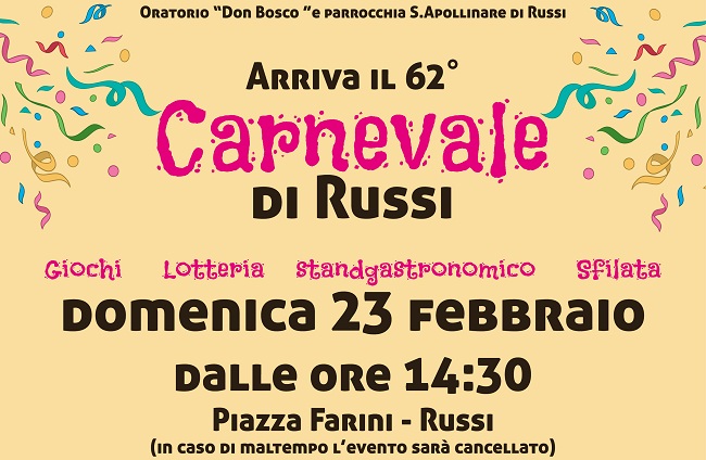 RUSSI (RA) – Domenica 23 febbraio 2020 a partire dalle 14.30 il 62° Carnevale di Russi, organizzato dall’Oratorio “Don Bosco” e dalla Parrocchia S. Apollinare in collaborazione con il Comune di Russi e il contributo dei negozianti e commercianti di Russi, animerà piazza Farini e le vie del centro storico con sfilata e relativo concorso delle maschere (con premi per la famiglia più originale, il gruppo più frizzante e il costume più bello), stand gastronomico, lotteria e giochi per tutti i bambini.