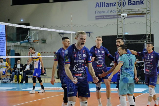Geetit Bologna – Wimore Salsomaggiore Terme 3-2 (22-25, 25-20, 26-24, 27-29, 16-14) – Geetit Bologna: Sitti 7, Baciocco 18, Giampietri 5, Listanskis 16, Maletti 20, Aprile 15, Callegati (L), Omaggi 8, Sacripanti 0, Ronchi 2, Brunetti (L), Minelli 0. N.E. Donati, Serenari. All. Guarnieri. Wimore Salsomaggiore Terme: Leoni 2, Cantagalli 9, Bucciarelli 2, Bulfon 21, Van Solkema 22, Bussolari 7, Monica (L), Zecca (L), Beltrami 0, Alberghini 15, Scita 0. N.E. Boschi, Riccò, Conforti. All. Mattioli. ARBITRI: Stellato, Marigliano. NOTE – durata tot: 139′.