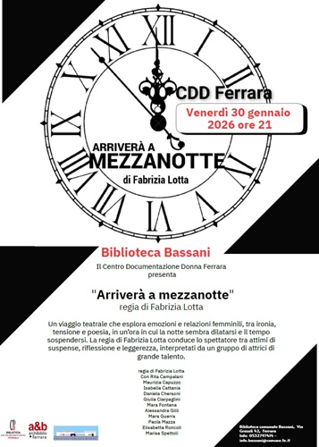 FERRARA – È un viaggio teatrale che esplora emozioni e relazioni femminili lo spettacolo “Arriverà a mezzanotte”, con la regia di Fabrizia Lotta, che venerdì 30 gennaio 2026 alle 21:00, andrà in scena alla biblioteca comunale Bassani (via Grosoli 42, Barco, Ferrara).
