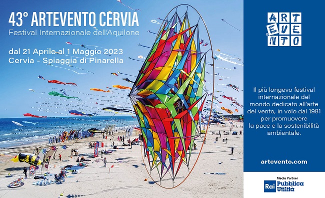 Dal 21 Aprile al 1° Maggio 2023, sulla Spiaggia di Pinarella di Cervia, 250 designer e piloti selezionati fra i più significativi interpreti di una tradizione millenaria in costante dialogo con l’ambiente, si uniscono a oltre 2000 appassionati per la 43esima edizione di ARTEVENTO CERVIA, l’originale festival dedicato agli aquiloni e all’ambiente, divenuto appuntamento di culto tanto per i promotori dell’arte eolica che per gli amanti del turismo green e della creatività sostenibile. La più completa rassegna di aquiloni d’arte, etnici, storici, giganti, sportivi, acrobatici e combattenti in volo simultaneo nelle aree dedicate, per tuffarsi nella magia di una pratica nata oltre 2500 anni fa.