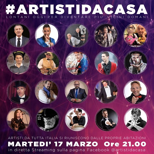 FAENZA (RA) – Un collettivo di 18 artisti da tutta Italia si daranno appuntamento martedì 17 marzo alle ore 21.00 per un grande show, in diretta streaming (Facebook), che porterà a casa delle famiglie italiane magia, musica e divertimento per combattere l’isolamento e trasmettere il messaggio che l’arte resiste e non si arrende.