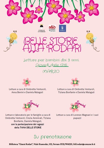 FERRARA – Le letture di “Belle Storie” alla biblioteca comunale Rodari di Ferrara (viale Krasnodar 102) si preparano alla primavera. Per i piccoli ascoltatori dai 3 anni è in arrivo un nuovo carico di racconti tutti dedicati alla nuova stagione: l’appuntamento è per giovedì 5 marzo 2026 alle 17:15 in compagnia di Ombretta Venturoli, Anna Benini e Daniela Malaguti dell’Associazione CIRCI.