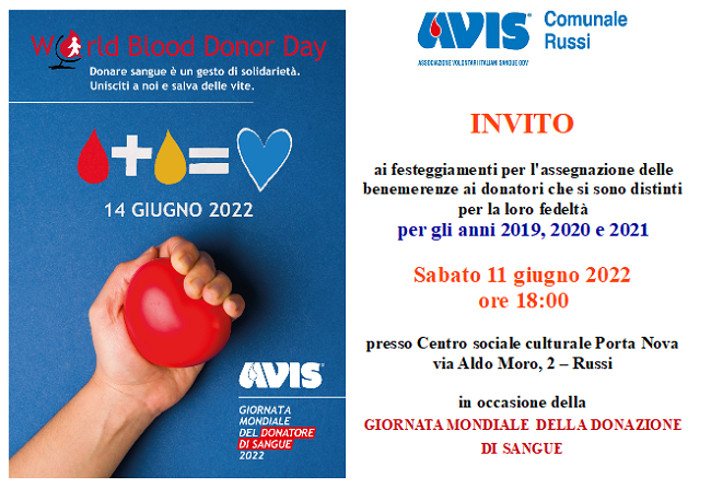 Sabato 11 giugno alle 18, premiazioni ai donatori e celebrazione della Giornata Mondiale del donatore di sangue presso il Centro Sociale Culturale Porta Nova di Russi