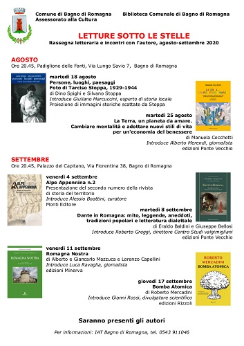La rassegna letteraria “Letture sotto le stelle” prevede sei serate di incontri con l’autore in programma dal 18 agosto fino al 17 settembre, con la presenza di alcuni tra gli autori romagnoli contemporanei più noti.