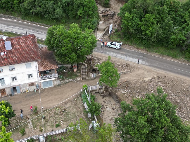 Il sorvolo del drone, durato alcuni minuti, è iniziato dal punto più critico, dove il canale è tracimato sulla Sp 19, e – risalendo il versante – ha raggiunto la strada comunale per Debbia, dove le acque hanno eroso una piccola parte della sede stradale e dove si sta pure lavorando in queste ore.