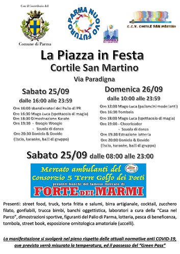 PARMA – È in programma per sabato 25 settembre dalle ore 8.00 alle ore 23.00 e domenica 26 settembre dalle ore 10.00 alle 23.59, c/o lo SkatePark di via Paradigna Cortile San Martino, la manifestazione “La Piazza in Festa” con balli, canti, karaoke, animazione, trucca bimbi, mago, gonfiabili e giochi per bambini, pesca di beneficenza, lotteria, tombola, esibizioni sportive, sbandieratori e figuranti del Palio di Parma, chearliders, esposizione ornitologica, street food, truck, torta fritta, banchi oggettistica e la partecipazione del mercato ambulante di Forte dei Marmi.