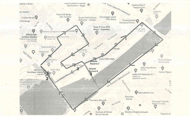 Il percorso standard interessa le seguenti vie: viale Tiberio, via dei Forzieri, via Bernardini, via Pozzetto, via Ortaggi, via Gervasoni, via Chiavica, via Marecchia, marciapiedi del ponte dei Mille, via Bastioni settentrionali, passerella parallela a via bastioni settentrionali, ponte di Tiberio. Possibilità di percorsi alternativi (scorciatoie all’interno del percorso) per persone con passeggini e/o sedie a rotelle.