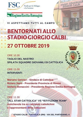 CATTOLICA (RN) – Cresce l’attesa in città per l’appuntamento “Bentornati allo Stadio Giorgio Calbi” di domenica prossima, 27 ottobre. Lo storico impianto calcistico comunale di via del Partigiano riabbraccia la città dopo gli interventi di riqualificazione che l’hanno interessato. L’appuntamento avrà inizio alle ore 10.30 con il taglio del nastro, sfileranno e si presenteranno sul terreno di gioco le squadre di calcio giovanili di Cattolica. Seguiranno gli interventi istituzionali con la presenza annunciata del Sindaco di Cattolica, Mariano Gennari, dei Presidenti della Provincia di Rimini, Riziero Santi, e della Regione, Stefano Bonaccini.