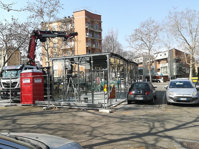 Dopo le opere propedeutiche è cominciata l’installazione delle strutture bipiano in vetro da 40 e 60 posti in piazza Manzoni e in piazza Dante