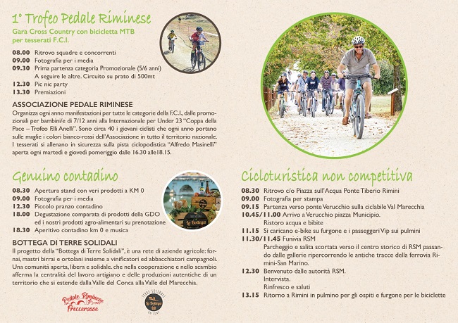Una manifestazione dedicata agli amanti del mondo delle 2 ruote e in particolare a chi è attratto dal cicloturismo esperienziale, che ha coinvolto 17 società sportive per un totale di 170 iscritti. Un’occasione, oltre che per andare alla scoperta della favolosa Val Marecchia, anche per riscoprire il cibo locale nel mercatino denominato “Genuino contadino”, organizzato con stand dedicati nell’area in Piazza sull’Acqua al Ponte di Tiberio, dove sarà organizzata la vendita dei prodotti alimentari a Km zero, con gli agricoltori aderenti alla rete della “La Bottega Terre Solidali” e dove contaminarsi con le tradizioni di cibo e cultura. “La Bottega Terre Solidali” ci occuperà anche di animare il tramonto con intrattenimento musicale.