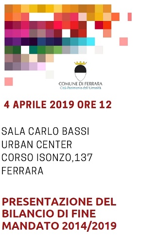 FERRARA – Giovedì 4 aprile 2019 alle 12, nella sala Carlo Bassi dell’Urban Center comunale (Corso Isonzo 137 – FE) avrà luogo la presentazione del “Bilancio di fine mandato 2014/2019”.