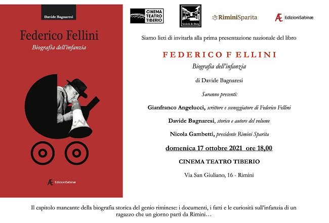 Lo storico riminese Davide Bagnaresi scrive Federico Fellini, biografia dell’infanzia (Edizioni Sabinae, 2021). Un percorso di ricerca lungo e spesso difficile influenzato da molti materiali in precedenza non verificati, hanno portato alla scrittura di una biografia attendibile basata su carte, riscontri testimoniali e molte nuove scoperte.