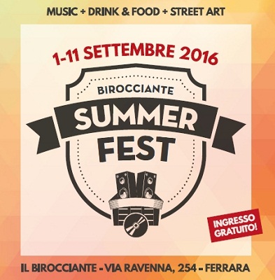 Ristorante Il Birocciante e FP Artists presentano la prima edizione di ‘Birocciante Summer Fest’: da giovedì 1 a domenica 11 settembre undici giorni di concerti ad ingresso gratuito, street food ed eventi speciali a Ferrara, nel parco verde adiacente alla rotonda tra via Ravenna e via Wagner a Ferrara.
