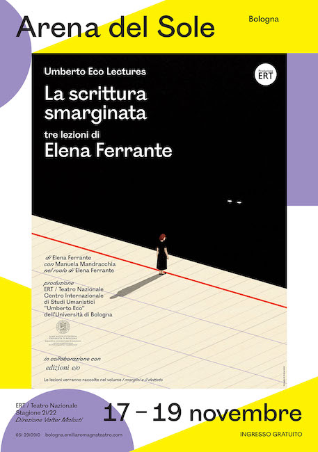 BOLOGNA – Da mercoledì 17 a venerdì 19 novembre 2021, alle 20.30 va in scena al Teatro Arena del Sole di Bologna “La scrittura smarginata – Le Umberto Eco Lectures” di Elena Ferrante, un ciclo di tre lezioni per ascoltare una figura amatissima della letteratura contemporanea italiana: tre differenti testi (La pena e la penna, Acquamarina, Storie, io) presentati al pubblico per la prima volta, a cui dà voce e corpo l’attrice Manuela Mandracchia.
