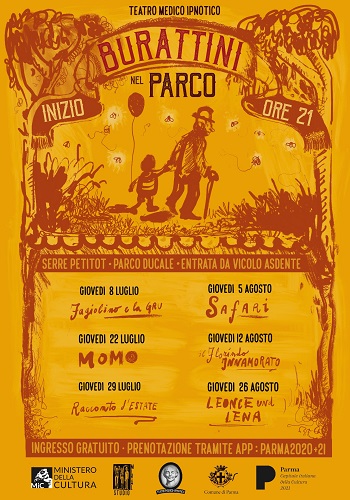 PARMA – Prende il via giovedì 8 luglio, alle ore 21 alle Serre Petitot del Parco Ducale, la rassegna di spettacoli di burattini a cura della compagnia Teatro medico ipnotico, organizzata dal Comune di Parma, nell’ambito dell’avviso pubblico Parma Estate 2021, con il sostegno del MIC – Ministero della Cultura.