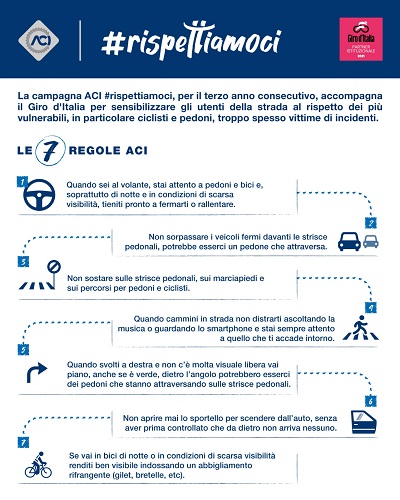 La campagna di sensibilizzazione prevede anche la messa in onda di uno spot su Rai 2, la diffusione di tutorial per la sicurezza e di testimonianze raccolte tappa dopo tappa da personaggi del mondo delle due ruote, postate sul portale ufficiale del Giro (https://www.giroditalia.it/) che ospita l’area #rispettiamoci dedicata alla sicurezza stradale a cura di ACI. Al contempo, il messaggio è amplificato sui canali web (http://www.aci.it/) e social di ACI. Attraverso il Giro d’Italia, la campagna ACI #rispettiamoci coinvolgerà milioni di spettatori e appassionati, contribuendo a far crescere la cultura della mobilità responsabile e una conseguente rivalutazione dei comportamenti quotidiani sulla strada.