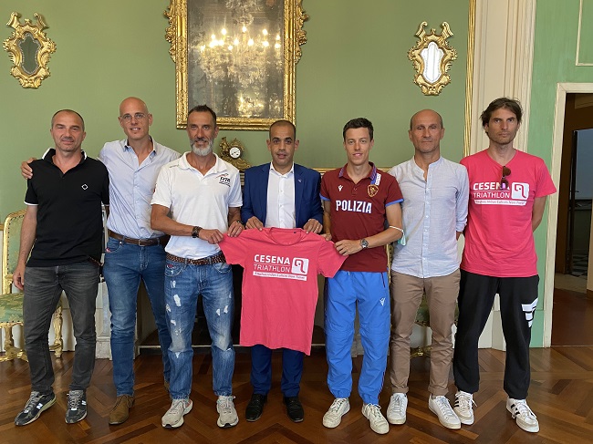 CESENA – Gli atleti Andrea Sanguinetti e Manuel Lama del Cesena Triathlon, in vista delle rispettive partenze a Targu Mures (Romania) e a Madrid (Spagna) sono stati accolti nel pomeriggio di lunedì 6 maggio in Comune dal Vicesindaco e Assessore allo Sport Christian Castorri. Presenti anche il Responsabile tecnico Riccardo Bedei, il Presidente del Cesena Triathlon Michele Montalti e il Vicepresidente Christian Bissioni.