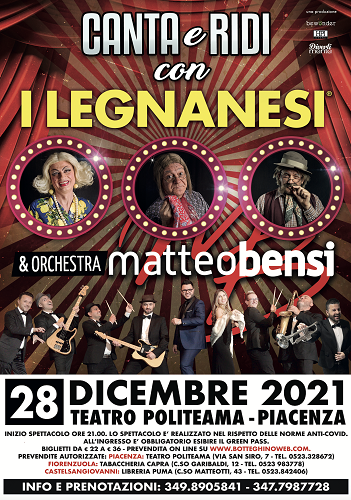 “CANTA E RIDI” è il nuovo spettacolo in anteprima nazionale con I LEGNANESI e L’ORCHESTRA DI MATTEO BENSI che andrà in scena MARTEDI 28 DICEMBRE alle ore 21, al Teatro Politeama di Piacenza, organizzato da Associazione Culturale Divertimente, Bewonder di Andrea Baldini e Hpi event, in collaborazione con il Comune di Piacenza nel contesto del bando “Piacenza riparte con la cultura”.