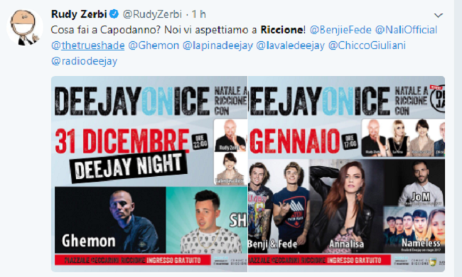 Il giorno dopo, il 1° gennaio, tornano in scena Rudy Zerbi, La Pina, Valentina Ricci, Chicco Giuliani, e insieme a loro il 2018 comincia con il giovane cantante Alessandro Coli, Jo M, il vincitore dell’edizione 2017 di DEEJAY On Stage, i Nameless, finalisti nella stessa edizione della scorsa estate e gli idoli delle folle Benji e Fede – Benjamin Mascolo e Federico Rossi – i due ragazzi che nel giro di pochi anni sono riusciti a dar vita ad un nucleo numerosissimo e solidissimo di fan che non li mollano un attimo, dai live ai social network.