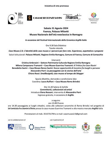 A seguire, nel Salone di Achille, si tiene una conferenza pubblica di Alessandro Porri sulle collezioni nelle case museo. Dopo la pausa pranzo nel chiostro di Palazzo dei Celestini, il programma prosegue con la visita alla collezione di Remo Brindisi ospitata nella casa museo di Guerrino Tramonti. Una passeggiata nel centro storico di Faenza e una visita alla mostra-mercato “Argillà Italia” concludono la giornata.