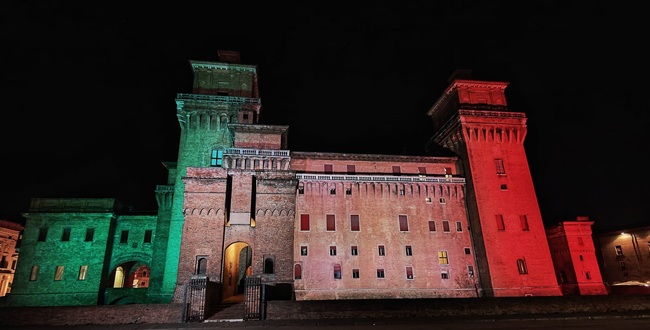 FERRARA – Castello illuminato con il tricolore italiano in occasione della Giornata dell’Unità nazionale, della Costituzione, dell’Inno e della Bandiera che ricorre oggi, martedì 17 marzo 2026, anniversario dell’Unità d’Italia.