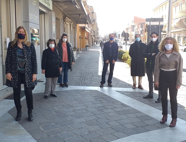 Nella foto: da sinistra la Sindaca Belinda Gottardi con Patrizia Bertaglia e Valentina Tassani, del Centro commerciale naturale di Castel Maggiore, Davide Segnan di Vendomeglio, Giovanni Riccioni di Ascom Confesercenti, Diego Tassinari, anch’egli del Centro commerciale naturale, l’Assessora alle attività produttive Barbara Giannerini