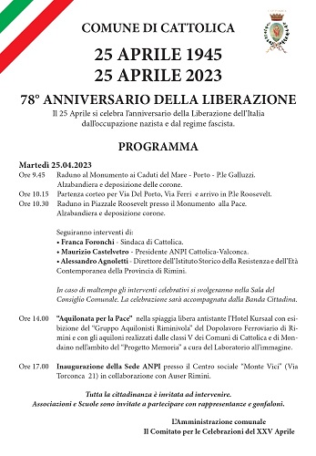 Dalle 10.30 in programma gli interventi della Sindaca di Cattolica, Franca Foronchi, del Presidente ANPI Cattolica-Valconca, Maurizio Castelvetro, e di Alessandro Agnoletti, Direttore dell’Istituto Storico della Resistenza e dell’Età Contemporanea della Provincia di Rimini. In caso di maltempo gli interventi celebrativi si svolgeranno all’interno di Palazzo Mancini, nella Sala del Consiglio Comunale. La celebrazione verrà accompagnata dal Corpo Bandistico di Colombarone. Tutta la cittadinanza è invitata ad intervenire. Associazioni e Scuole sono invitate a partecipare con rappresentanze e gonfaloni.