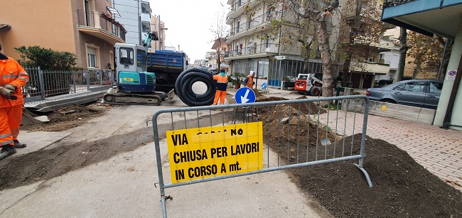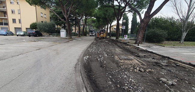 In via Trento il cantiere prosegue con le operazioni per l’interramento dei cavi dell’energia elettrica. La strada è interessata da un intervento di riqualificazione che le cambierà il volto. La nuova carreggiata presenterà alcuni disassamenti (chicane) di direzione ed una leggera sopraelevazione, con l’incrocio di Via Bologna, al fine prevedere e regolare la velocità veicolare. Uno dei marciapiedi (lato monte), infatti, sarà della larghezza minima di 1,50 metri per tutta la lunghezza della Via Trento così da garantire la fruizione pedonale a tutti gli utenti, l’altro marciapiede (lato mare) avrà una larghezza variabile tra gli 80 e i 110, sufficiente per un buon utilizzo. I marciapiedi sono previsti solo lievemente rialzati rispetto alla carreggiata carrabile (circa 7 cm) al fine di dare percezione più ampia della sede stradale.