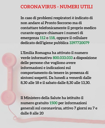 – L’Emilia Romagna ha attivato il numero verde informativo 800.033.033 a disposizione delle persone che vogliono avere informazioni e indicazioni sul comportamento da tenere in presenza di sintomi sospetti. Da lunedì a venerdì dalle 8.30 alle 18 e il sabato dalle 8,30 alle 13.30.