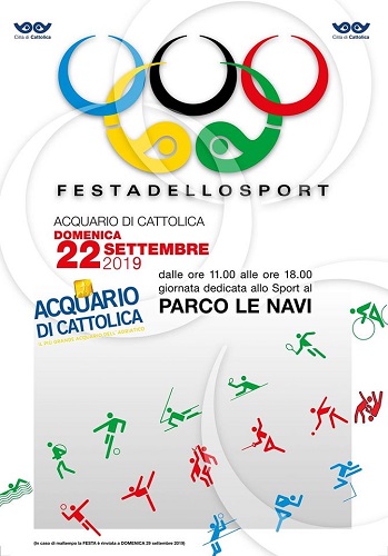 CATTOLICA (RN) – Domenica 22 settembre 2019 l’Amministrazione Comunale e le Associazioni sportive cittadine, in collaborazione con l’Acquario di Cattolica, invitano a partecipare alla 12esima edizione della “Festa dello Sport”. Un evento che oramai è una vera e propria tradizione per l’intera città, una straordinaria manifestazione non-stop, aperta a tutti dalle 11.00 alle 18.00. L’area del Parco Le Navi, con ingresso libero e gratuito, si trasformerà ancora una volta in un “Campus dello Sport”, un appuntamento gioioso e condiviso, dedicato a tutte le attività sportive della città ed animato da esibizioni e spettacoli.
